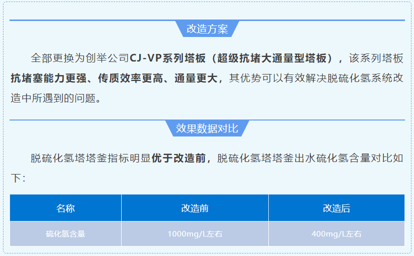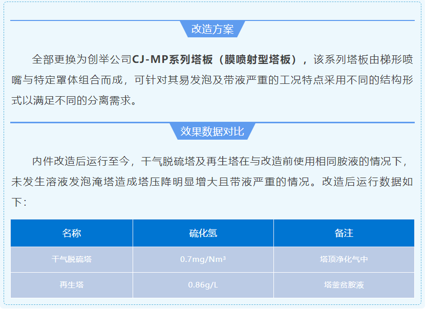 全部工程改造完工后,各項技術指標均滿足生產要求,達到了改造的目的和預期,緩解業主單位的環保壓力的同時延長了設備檢修周期。創舉公司新型CJ系列高效噴射態塔盤技術在脫硫化氫塔、干氣脫硫塔及再生塔的應用效果,得到了陜西某公司領導的高度認可。該項目的順利開車是創舉公司在行業內的又一次成功改造案例。