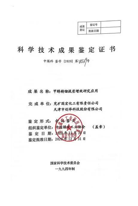 2020年底,中國煤炭工業(yè)協(xié)會組織有關(guān)專家,對國宏公司及創(chuàng)舉科技共同申報的“甲醇精餾提質(zhì)增效研究應用”技術(shù)進行科學技術(shù)成果鑒定。經(jīng)專家鑒定,該項技術(shù)成果達到“