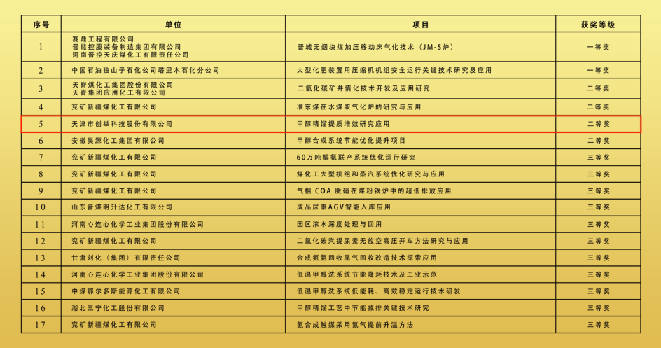 會上,中國氮肥工業協會對科技創新方面做出突出貢獻的企業進行了表彰。天津市創舉科技股份有限公司(以下簡稱“創舉科技”)申報的“甲醇精餾提質增效研究應用”項目,榮獲中國氮肥工業協會科學技術獎二等獎。