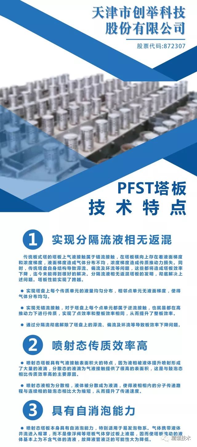 全逆流無返混噴射塔板,簡稱全逆流PFST塔板(發明專利號:201210513678.0),以全逆流和持液降泡兩個新概念為指導思想,從理論計算到化工過程模擬計算,從實驗數據的測量到塔板結構的優化,針對不同的問題提出了不同的結構改進。